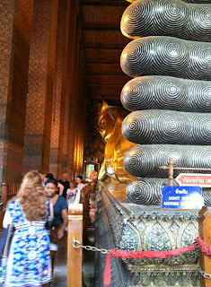 Saturday after breakfast, Junior, Ryanne, Alli, Jessica and I set out to explore and sightsee around Bangkok. Alli and I had thought the plan was to be back in time to go to the second concert, that day at two. Apparently that was not the plan. We saw Wat Pho, which is a massive temple next to the grand palace. It houses the Reclining Buddha, which was really huge. It was a really interesting statue, and Alli and I got lost in the rest of the Wat trying to find our way out. Wats here are so intricate and decorated everywhere. There were rows and rows of Buddhas lining the walls. In addition to the Reclining Buddha, there were little buildings with other Buddha statues, like the Buddha of Saturday and others.